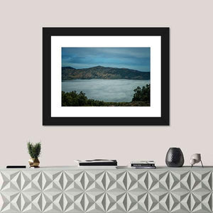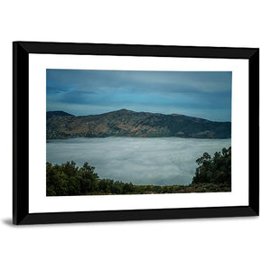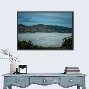 A realistic landscape showing mountain peaks, a tree-lined valley and a thick layer of fog drifting through low clouds. The blue, green and gray palette gives the scene a serene, misty atmosphere that suits modern or nature-inspired rooms like living rooms or bedrooms.