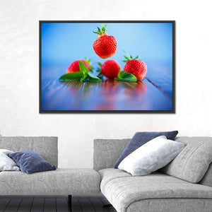 This vibrant canvas showcases plump strawberries glistening with dew, set against a serene blue background. The composition captures every detail, making it a refreshing addition to any kitchen or dining space.