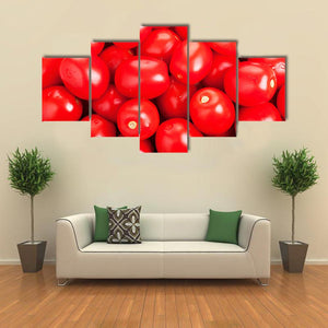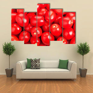 This canvas art features a close-up view of fresh cherry tomatoes, showcasing their vibrant red hues. The vibrant color palette and photorealistic style evoke a sense of health and vitality, making it an excellent addition to any kitchen or dining area.