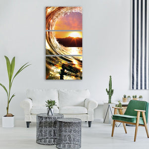 Experience the dynamic beauty of ocean waves meeting a dramatic sunset in this vibrant canvas art. The close-up composition showcases a stunning palette of orange, yellow, blue, and purple, evoking a serene yet powerful atmosphere.