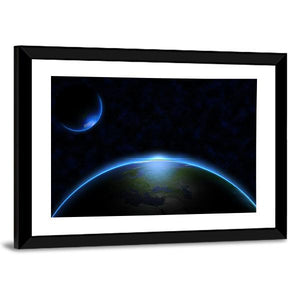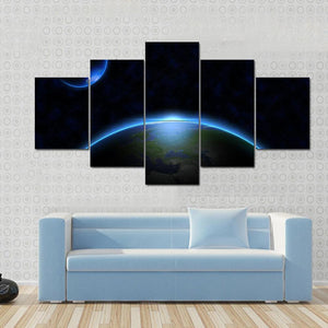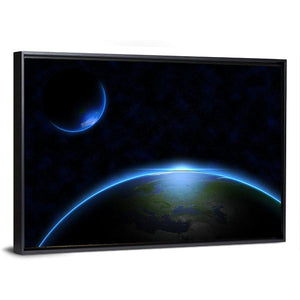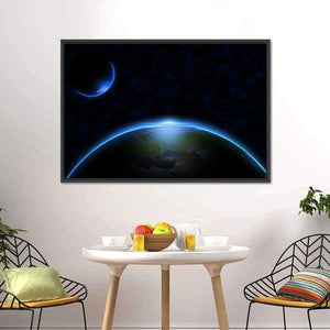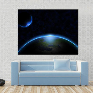Experience the cosmic beauty of Earth with this modern canvas art. Featuring a serene scene of our planet surrounded by stars and a glowing atmosphere, it adds a touch of awe to any space.
