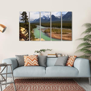 River Flowing At Foot Of Canadian Rockies Canvas Wall Art