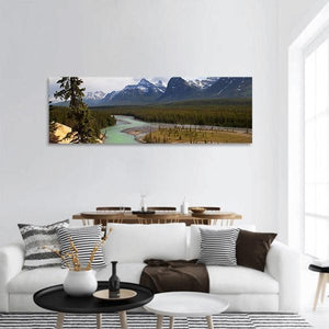 A panoramic nature photograph of a turquoise river winding through a valley at the foot of the Canadian Rockies, with snow-capped peaks and dense pine forest. The green-blue palette and deep depth of field create a serene, majestic, and expansive mood, well suited to modern room decor and nature-themed spaces.