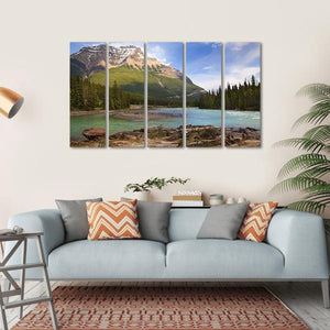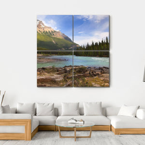 This captivating landscape features a tranquil river meandering through the majestic Canadian Rockies, flanked by lush forests and rugged rocks. The serene palette of greens, blues, and browns invites a sense of calm and connection to nature.