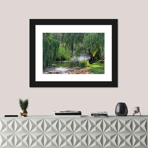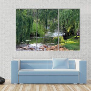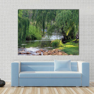 This canvas art captures the serene flow of a river surrounded by weeping willow trees, rocks, and grass. With its natural palette of green, brown, blue, and white, it creates a peaceful atmosphere that brightens any space.
