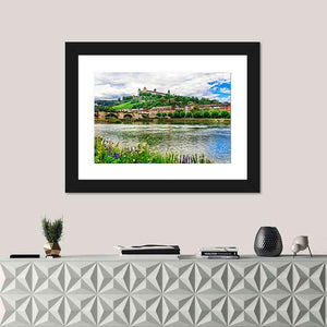 This canvas captures a river near Wurzburg, winding past an arched bridge and a stone castle on a sunlit hillside, with wildflowers in the foreground. Rendered in a realistic, vibrant palette of blues, greens and browns, the scene feels picturesque and serene. Suited to living rooms or modern, nature-focused spaces as calming wall decor.