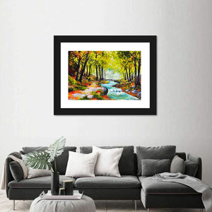 This canvas art captures a tranquil forest scene, featuring a gentle stream and vibrant autumn trees. With its impressionistic style and rich palette of greens, yellows, and oranges, it invites a sense of peace into your space.