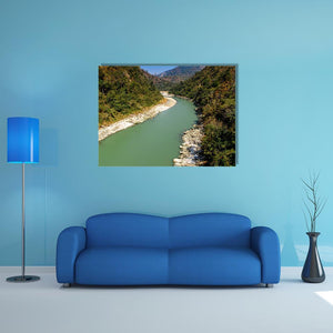River In Darjeeling depicts a winding river threading through mountains and lush forest. The aerial perspective and green-blue palette give a peaceful, serene, and vast atmosphere with rocky riverbanks and soft grey tones. It suits modern, nature-inspired home rooms and calm living spaces.
