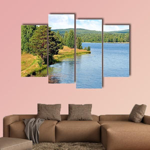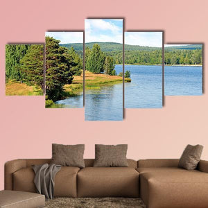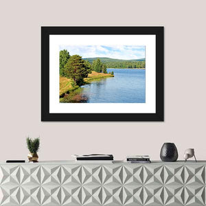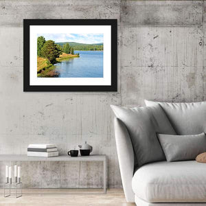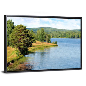 This canvas shows a calm river in Sweden on a bright summer day, with pine trees along a grassy shoreline and low hills beyond. The realistic scene feels peaceful and natural and suits nature-focused or modern room decor.