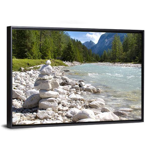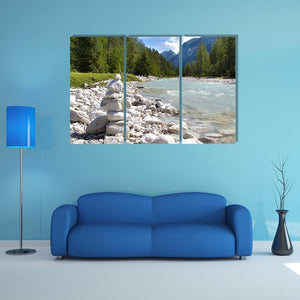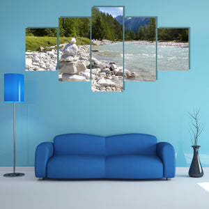 River Isar at the Alps shows a peaceful mountain river scene with a cairn of stones in the foreground, flowing water, forested banks, and distant peaks. The photorealistic print uses blues, greens, greys and whites and is composed with the rule of thirds, making it a calm choice for modern, nature-inspired rooms.