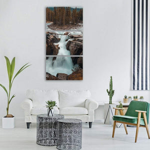 A realistic landscape print showing a river, waterfall, forest and rocky shore in brown, white, blue, and green tones. The image reads both serene and wild, with motion blur in the water and coniferous trees at the edge. It suits nature-focused or modern rooms as an eye-catching wall art piece.