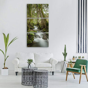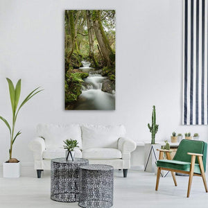 A forest stream and waterfall in Germany, captured with a long-exposure effect that softens the rushing water and emphasizes motion. Lush greens, mossy browns and soft grays create a serene, tranquil mood, while a depth-focused, rule-of-thirds composition guides the eye along the scene. This nature-driven piece fits rustic or nature-themed rooms looking for calm, organic wall decor.