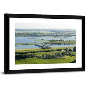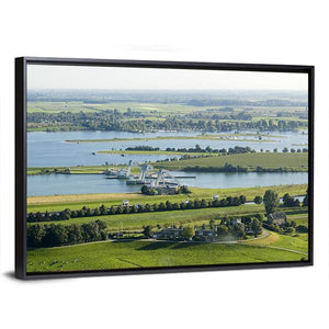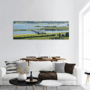 The River Rhine Panoramic Canvas Wall Art captures a wide-angle riverscape featuring a dam with cranes, boats, grasslands and rows of trees. The photorealistic scene feels serene and vast with an industrial edge in blue and green tones. It fits modern, nature-focused interiors such as living rooms or offices.