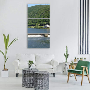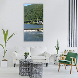 River Shoreline In France depicts a serene riverside scene centered on a dam with a yellow railing and a small waterfall, backed by a green hillside and a white building with a prominent chimney. The realistic blue, green, yellow and white palette creates a calm, natural atmosphere. Suited to modern or nature-inspired rooms as tasteful wall art.