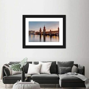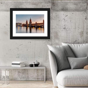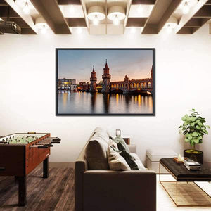 This serene canvas art captures the iconic Oberbaum Bridge over the River Spree in Berlin, emphasizing a tranquil urban scene. The photorealistic depiction showcases the intricate details of the arched bridge and the soft reflections of lights on the water.
