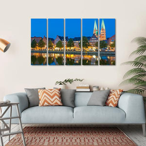 This canvas wall art features a serene view of the River Untertrave, showcasing beautiful waterfront buildings and a church with two tall spires. With a calming palette of blue and orange hues, it captures the tranquil atmosphere of an evening scene.