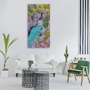Aerial view of a river cutting through a canyon, with turquoise water threading between rocky cliffs and dense trees and small yellow objects visible in the water. The scene feels serene and slightly adventurous, with clear depth and natural colors that work well as modern or nature-inspired wall decor.