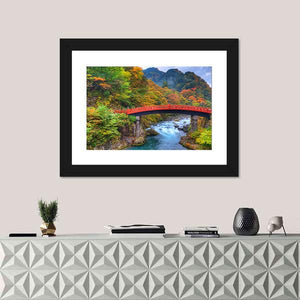 River With Shinkyo Bridge in Nikko shows a red arched bridge spanning a calm river, framed by autumn foliage and distant mountains. The realistic, vibrant scene uses depth and a rule-of-thirds composition and a palette of reds, blues, greens and warm browns to feel both scenic and serene. Ideal as wall art for living rooms or hallways that welcome nature-focused decor.