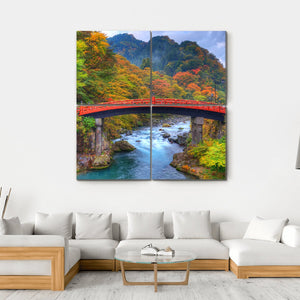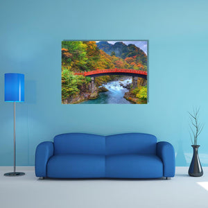 Experience the vibrant beauty of nature with this canvas art featuring the iconic red Shinkyo Bridge over a serene river. Surrounded by majestic mountains and autumn trees, the artwork captures a picturesque landscape that brings warmth to any space.