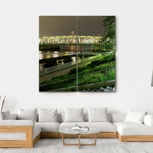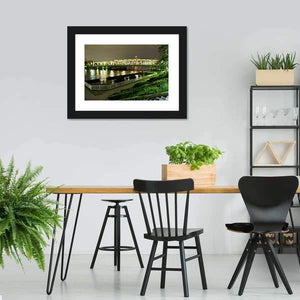 This vibrant cityscape captures an illuminated bridge over a tranquil river, depicting the nighttime skyline of Japan. The reflections on the water create a soothing yet dynamic atmosphere, making it a striking addition to any modern space.