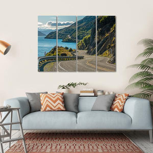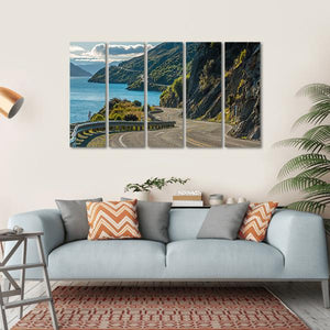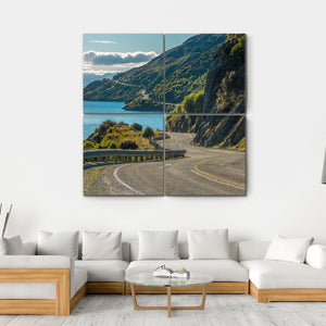 This canvas art captures a scenic winding road along Lake Wakatipu in Queenstown, framed by dramatic mountains and a touch of vibrant ocean hues. The serene composition invites a sense of calm, making it a wonderful addition to any landscape-focused décor.