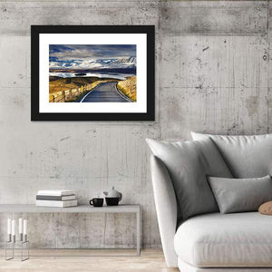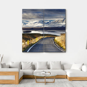 This canvas art captures a winding road leading to the majestic snow-capped mountains of New Zealand, with a serene lake and a charming wooden fence. The calming palette of blue, white, and green inspires a sense of adventure and tranquility.