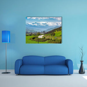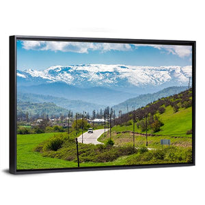 Road In A Mountain Village presents a realistic landscape: a winding road through green hills leading toward snow-capped mountains, with a single white car and visible power lines. The green, blue, white, and gray palette creates a serene, vast, and inviting mood that fits modern or nature-inspired rooms.