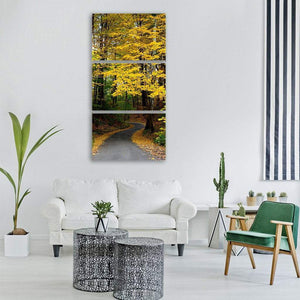 A winding forest road lined with yellow and brown leaves sets a serene, autumnal scene. The composition uses depth and leading lines to draw the eye down the path, creating a peaceful, contemplative mood. Suits modern or nature-inspired rooms as calm wall decor.