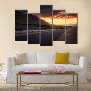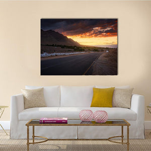 Road In Ladakh At Sunset is a photorealistic canvas print of a mountain road leading into distant peaks beneath a dramatic sunset and storm clouds. The dynamic perspective—with a yellow dividing line and rocky embankment—draws the eye into contrasting dark greys and warm oranges and yellows for a transitional, awe-inspiring mood. Works well with modern home decor and contemporary interiors as a bold landscape accent.