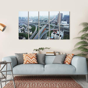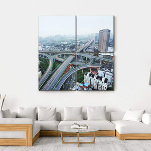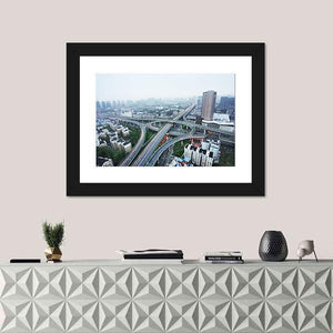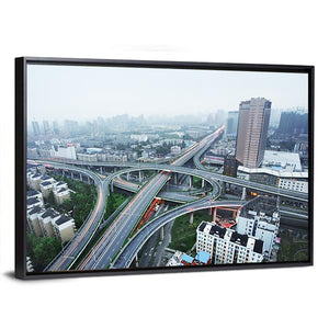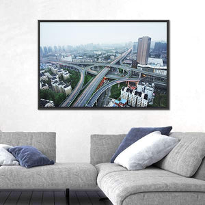 This artwork captures an aerial view of a busy highway interchange in Hangzhou, China. With a palette of gray, blue, and green, it reflects the urban energy and complexity of city life, making it a fitting addition to modern décor.