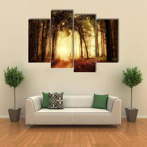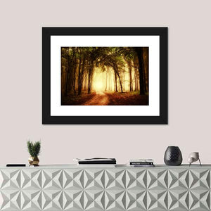 This canvas wall art captures a serene forest path illuminated by sunbeams filtering through golden leaves. Its photorealistic style and tranquil atmosphere invite a touch of nature into your space.