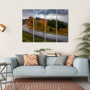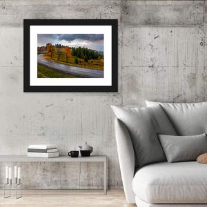 This canvas art captures a tranquil road winding through an autumn forest. With rich hues of green, brown, and orange, it evokes a serene atmosphere, perfect for bringing the essence of nature indoors.