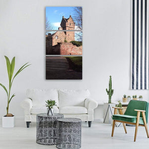 This realistic landscape depicts a paved path leading to a multi-story stone castle beside an old red brick wall. Its historic, serene, and architectural mood, with brown, gray, green, and red tones, makes it a natural fit for living rooms and studies.