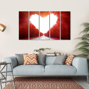 The Road To Love canvas art captures a romantic landscape featuring a heart-shaped opening framed by trees and vibrant autumn leaves. The serene scene, illuminated by sunlight and reflected on a wet road, invites warmth and hope into any space.