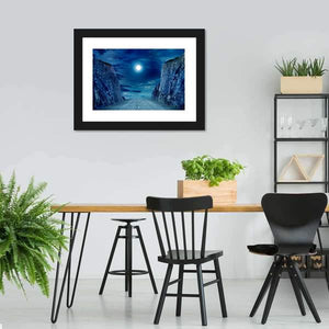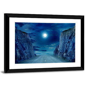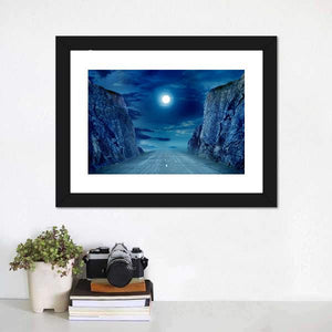 Road To Moon Canvas Wall Art shows a road between rocky mountains under a moonlit night sky, the white dashed center line drawing the eye toward a moon partly obscured by clouds. Rendered in realistic blues, whites, and greys, the scene feels mysterious, serene, and dramatic — a good fit for modern homes and moody room decor.