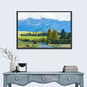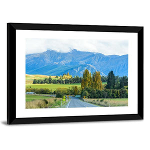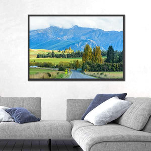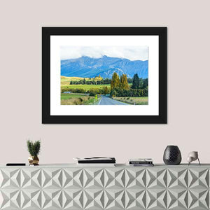 Road To South New Zealand shows a quiet road winding through green fields and trees toward distant mountains. Soft blues, greens, browns and white give the scene a peaceful, expansive feeling. The realistic nature style fits modern or nature-inspired rooms.
