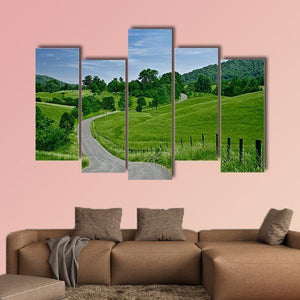 A winding road curves through the green foothills of the Blue Ridge Mountains, with trees and fence posts under a clear blue sky. The scene feels serene and inviting, a rustic landscape print that suits house or nature-themed rooms.