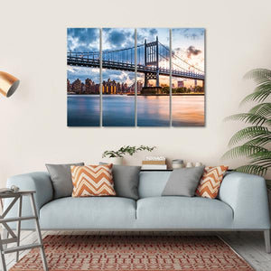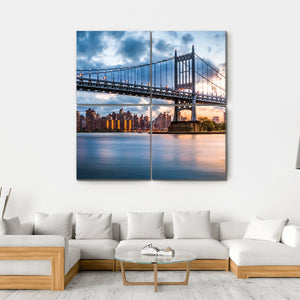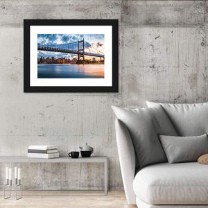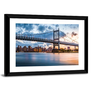 This canvas art captures the majestic Robert F Kennedy Bridge, framed by a tranquil urban skyline and a serene river. With a palette of blues, oranges, and greys, the scene comes to life, featuring illuminated city buildings and dramatic clouds, inviting a peaceful ambience to any space.