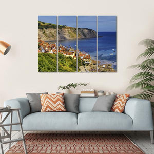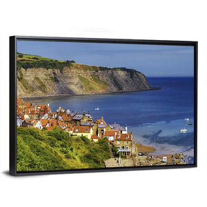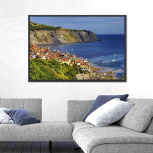 This canvas wall art captures the serene beauty of a coastal village in Robin Hoods Bay. With a high-angle view, it showcases red-roofed houses against a backdrop of cliffs and ocean waves, all bathed in a sunny palette of blues, greens, and whites.