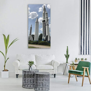 This canvas shows multiple rockets at an outdoor museum display, viewed from a slightly low angle to emphasize scale. The realistic scene — white-and-black rockets labeled UNITED STATES against a partially cloudy blue sky with green foliage at their base — conveys a historic, awe-inspiring mood and suits modern living rooms or offices.