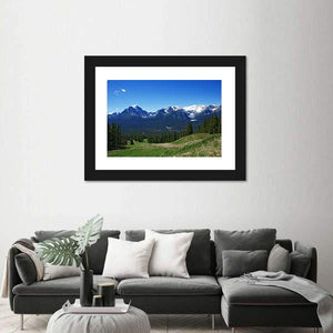 Rockies Mountains in Banff, Canada presents a realistic mountain landscape with snow-capped peaks, coniferous trees, grassy foreground and a wide valley beneath a pale summer sky with a single cloud. The scene feels majestic and serene and works well as a natural focal piece for modern homes and everyday room decor.