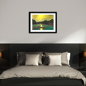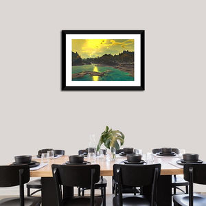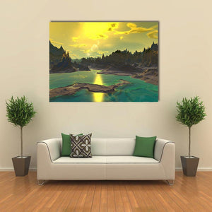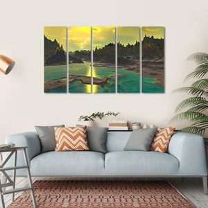 This captivating canvas print features an alien landscape with striking rock formations and a serene body of water. The ethereal palette of yellow, blue, and green creates a dramatic atmosphere, perfect for adding a sense of wonder to your space.