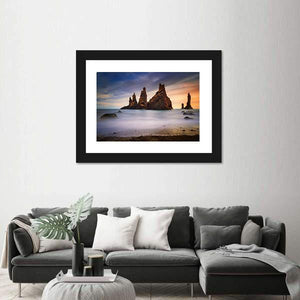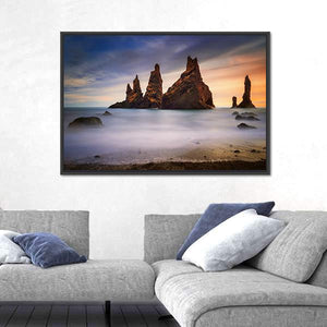 Rocks On Black Beach In Iceland captures rock formations, ocean and sky at a black sand shoreline, with long-exposure water that softens the surf. Composed using the rule of thirds and a modern palette of blue, orange, brown and white, the scene feels both serene and dramatic. It suits modern home decor and works well in living rooms or bedrooms.