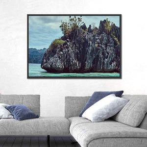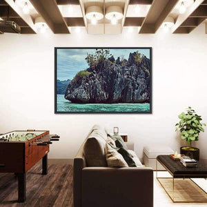 This canvas art captures the serene beauty of a rocky island surrounded by turquoise waters and lush green vegetation. With distant mountains and a cloudy sky, it evokes a natural, tranquil vibe perfect for any living space.