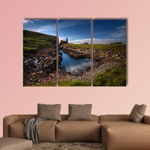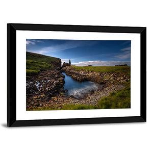 A landscape photograph of a rocky Scottish coastline and inlet, featuring a tall, tower-like rock formation beside calm, misty water under a blue sky. Blues, greens, grays and browns give the scene a serene yet dramatic, rugged mood; it pairs well with modern or nature-inspired room decor.