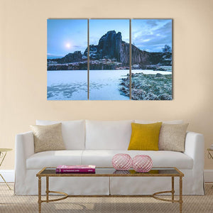 A photorealistic winter landscape of a rocky hill and frozen lake beneath a blue-gray sky. Sunlight breaks through clouds and highlights geometric rock columns, giving the scene a serene, cold, and dramatic atmosphere. Suited to modern interiors or nature-focused rooms.