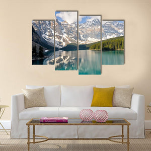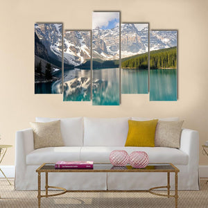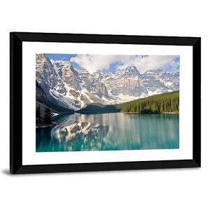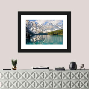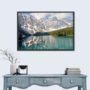 This canvas features a serene landscape of snow-capped mountains and Moraine Lake in Canada. With rich blue and green hues, it evokes a tranquil atmosphere that complements any natural decor.