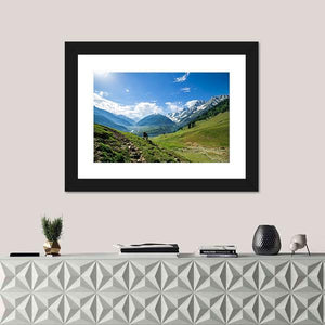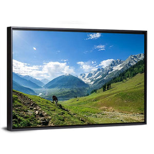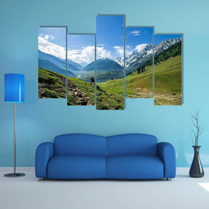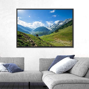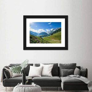 This canvas captures a wide, rule-of-thirds landscape of the Rocky Mountains and green fields in Jammu and Kashmir, with snow-capped peaks, a river, sunlit hills, trees and a lone animal on a hill. Rendered in realistic, vibrant blues, greens, whites and browns, it creates a peaceful, scenic, majestic mood that suits modern, nature-themed rooms.