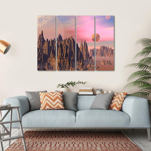 Explore a serene alien landscape filled with jagged rock formations, moons, and planets. This digital art piece captures a surreal atmosphere with a palette of pink, purple, and blue, making it a striking addition to your wall decor.