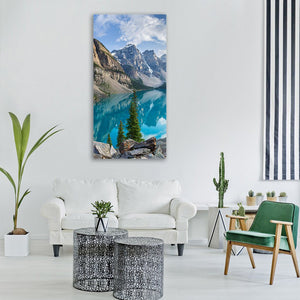 This vertical canvas art captures the serene beauty of Moraine Lake in Canada, framed by majestic rocky mountains and dense evergreen trees. With its tranquil blue waters reflecting the snow-capped peaks, this piece brings a touch of nature's splendor to any space.